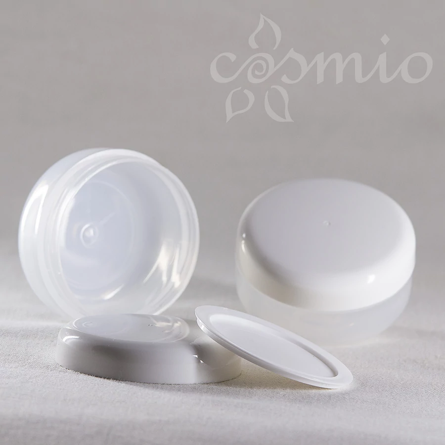 Kozmetikai PP-tégely, áttetsző, fehér kupakkal, különböző méretekben. A tégelyekben műanyag zárólapka található, mellyel lezárhatjuk a krémet, így az nem jut a tégely kupakjába.